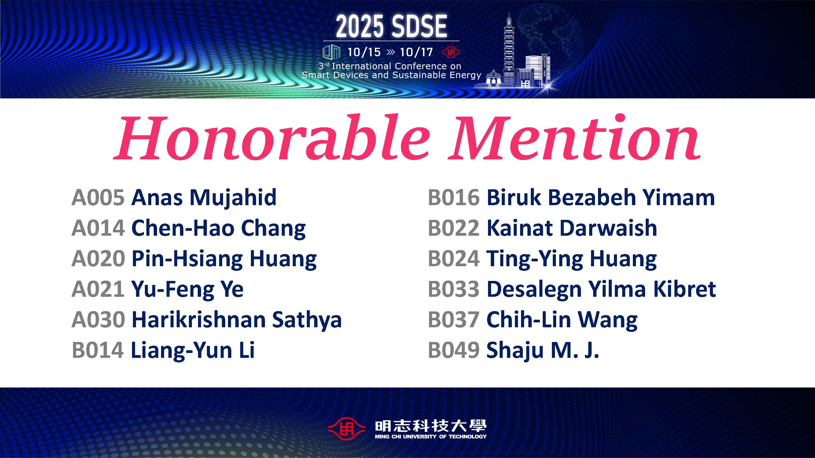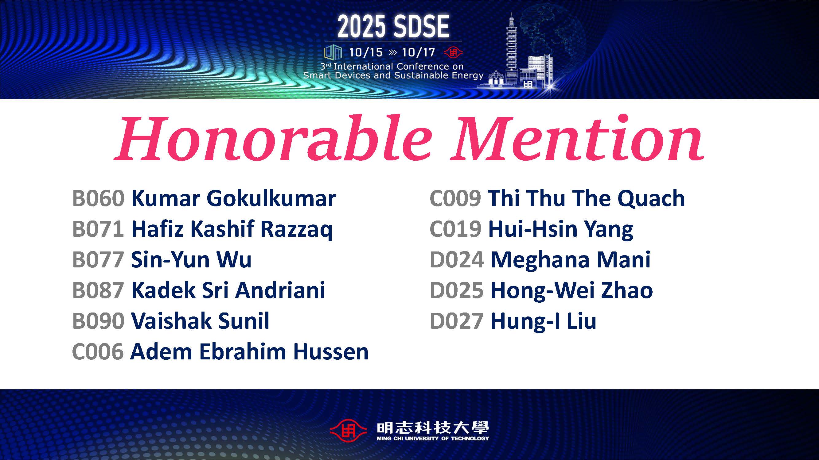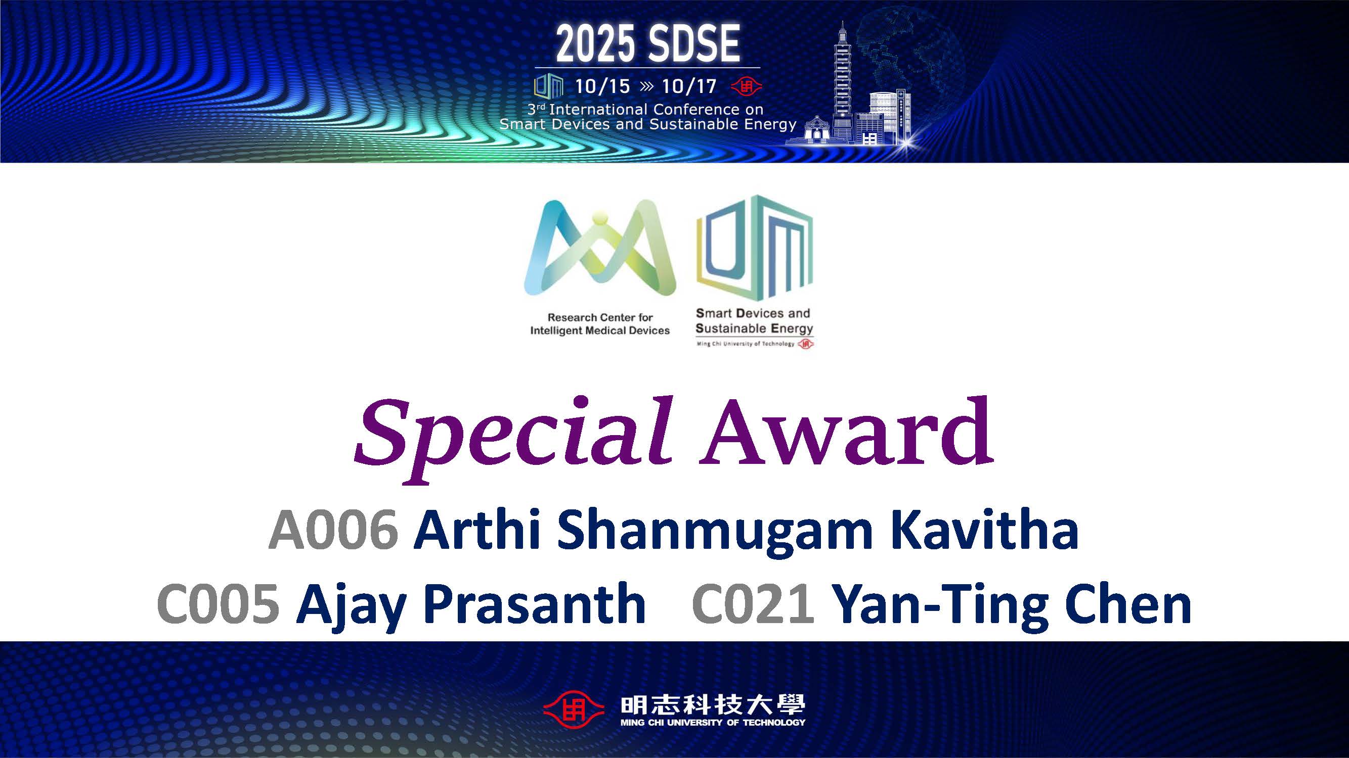 Welcome to the 2025 International Conference on Smart Devices and Sustainable Energy (SDSE 2025), scheduled for October 15th to 17th, 2025 in New Taipei City, Taiwan. SDSE 2025 aims to illuminate the indispensable linkages between "renewable energy", "sustainable environment" and "artificial intelligence" applications.